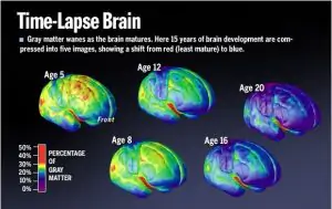 At the age of 3, our brains have more neurons (the cells in our brain that send and receive neurotransmitters) than we will have for the rest of our lives. From the ages of 3 to 25, our brains go through a process where unused neurons are pruned. The brain is in a constant state of growth and change in the early years, which this image illustrates:
