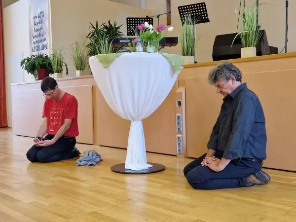 The guy in the red shirt did translation from English to German. Karima, who works with Loveismore, is standing to my right in the picture on the left. At the end of the conference I invited everyone to kneel and pray. I love those times when everyone is praying.